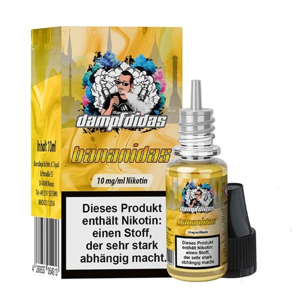 Beschreibung: Das Nikotinsalz Liquid Bananidas von Dampfdidas schmeckt nach einem leicht kühlen Milch Shake aus süßen Bananen.